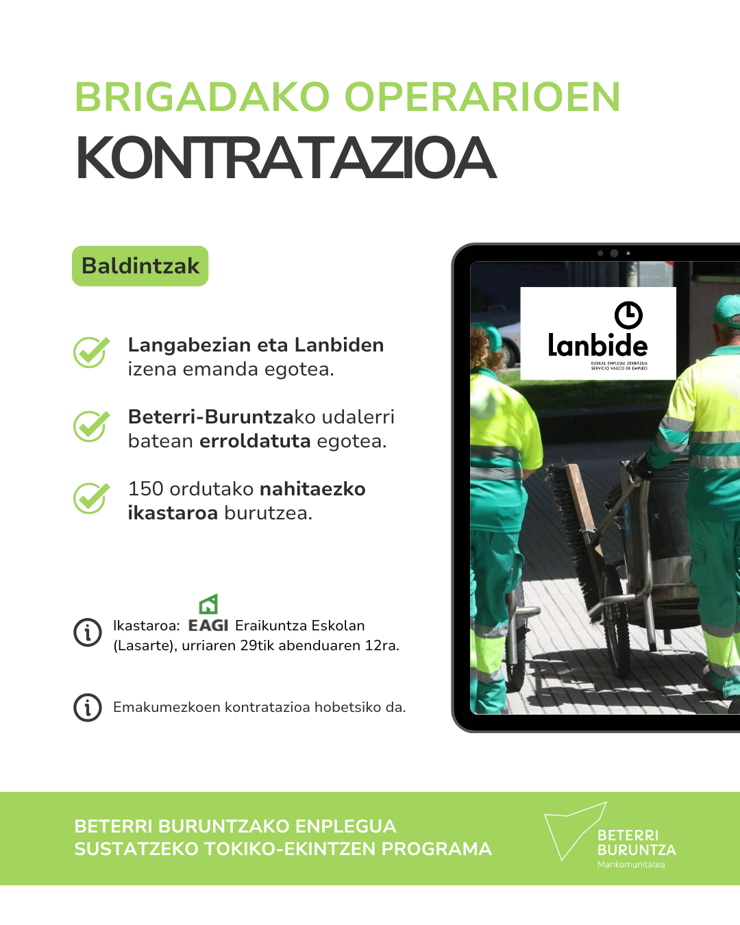 Operarioen kontratazioetan izena emateko esteka: https://web.lanbide.eus/apps/OF_DETALLE_OFERTA_TRABAJO?LG=E&ML=OFEMEN1&MS=Eaaa&IDRG=162025011132&CTRG=1&fbclid=IwY2xjawNUSe1leHRuA2FlbQIxMAABHjZsaISRm9lyAOAoaGM5e_Odrp-ym1j7A7gQsk1XdWm8qiQztG9KjvxV2TmX_aem_yCyAcK_6VjgGsuLaPEl_uw