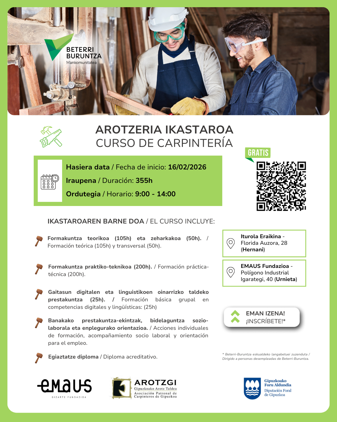Bestalde, otsailean Tamaina Handiko Arotzeria eta Kudeaketa ibilbidea jarriko da martxan, Emaus Gizarte Fundazioa eta Arotzgi erakundeen eskutik. Prestakuntza horrek zurgintzaren arloan kualifikazio teknikoa eskaintzea du helburu, sektorean dagoen langile kualifikatuen eskariari erantzuteko.