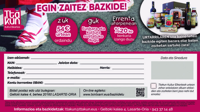 Eta oraindik bazkide ez bazara, orain duzu une onena! Urtarrilaren 10a baino lehen batzen bazara, Errigorako otar baten zozketan parte hartuko duzu. Eta lamina ere jasoko duzu opari. Hauxe duzu bide zuzenena: https://txintxarri.eus/
