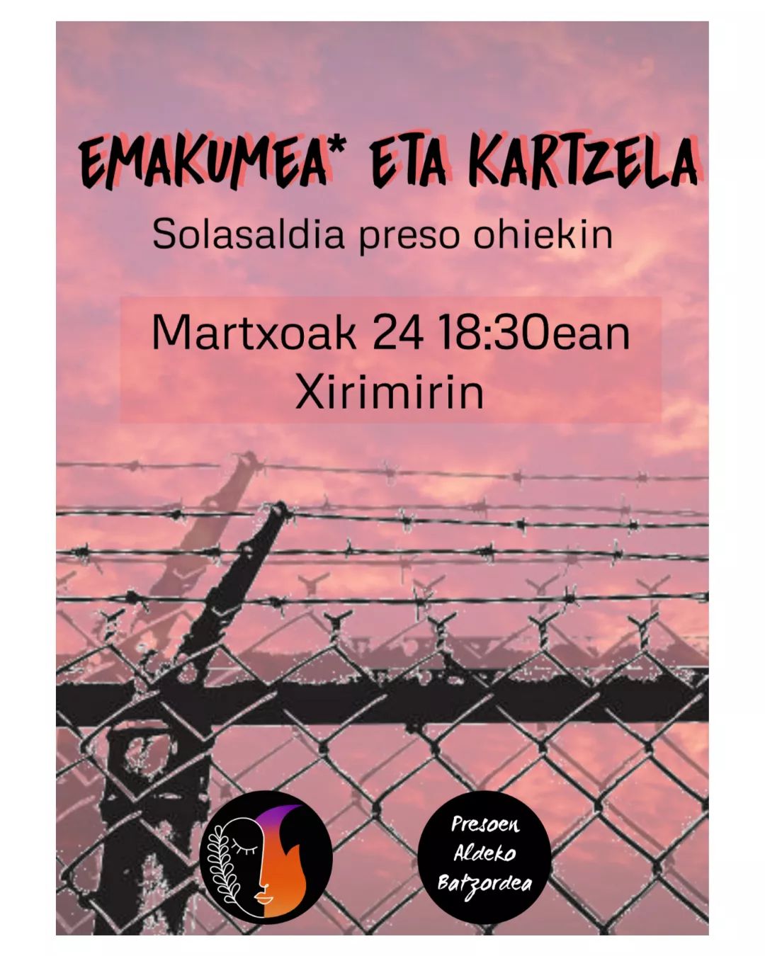 aSUnak neska* gazteen taldeak eta Lasarte-Oriako Presoen Aldeko Batzordeak antolatuta, emakumeen espetxetako zapalkuntzaren berri izateko aukera izango dute herritarrek gaur arratsaldean, Xirimiri elkartean, 18:30ean. Emakumea* eta kartzela hitzaldia antolatu dute. Preso ohi zenbaitek haien lekukotzak partekatuko dituzte.