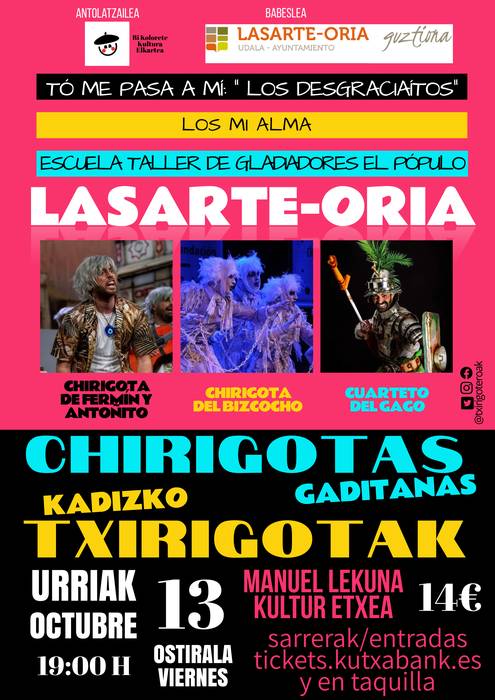 Udaleko Festak arloko buru Txus Alonsok azpimarratu duenez, "punta-puntako" kartela ekarriko dute egun horretan Lasarte-Oriara, Cadizeko txirigoten lehiaketan aurreneko postuetan sailkatu diren taldeetako hiru igoko baitira Manuel Lekuona Kultur Etxeko oholtza gainera, 19:00etatik aurrera. Ikuskizunak bi ordu eta erdi iraungo ditu eta sarrerek 14 euro balio dute. Kultur etxeko leihatilan edota Kutxabank Sarrerak atari digitalean eros ditzakete dagoeneko lasarteoriatarrek. "Programazioaren berri izandakoan, batek baino gehiagok esan digu harritzekoa dela horren maila altuko txirigotak ekartzea Gipuzkoara", nabarmendu du Alonsok. Herritar guztiak gonbidatu ditu emanaldi horretaz gozatzera.