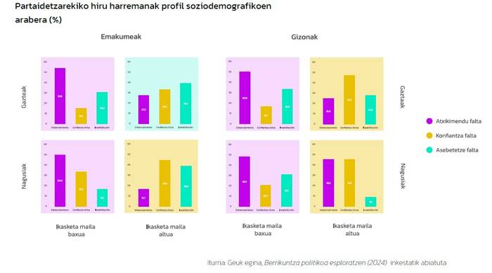 Herritarren erdia edo lot daiteke atxikimendu faltarekin; erdia izateak kezkatzen gaitu. Gainerakoak konfiantza zibikoa edo asebetetze falta deitu ditugun horietan daude. Konfiantza zibikoa duten pertsonak baikorragoak dira, demokraziarekiko konpromisoa dute edo ez dira mesfidatiak; eta, aldiz, asebetetze falta dutenak, kontrakoa. Demokraziarekiko mesfidantza, haserrea eta ezaxola dute nahiz eta politikarekiko interes handia izan. Hori demografikoki nagusi da talde bakar batean: ikasketa maila altuko emakume gazteak. Arrazoiak askotarikoak izan daitezke, baina seguru asko, emakume eta gizon gazteen artean ematen ari den dibergentzia da.