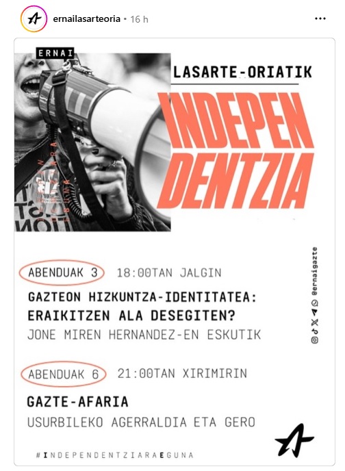 Bestalde, Ernaiko kideek jakinarazi dute ostiralean gazte afaria egingo dutela Xirimiri elkartean, eskualde mailako agerraldia eta gero (Usurbilen izango da). 21:00etan hasiko dira afaltzen.