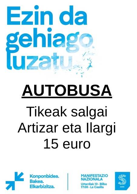 Ezin da gehiago luzatu lelopean egingo dute larunbateko manifestazioa. 17:00etan abiatuko dira parte hartzaileak, La Casilla kiroldegi kanpoaldetik. Egun osoko egitaraua antolatu du Sare Herritarrak:
