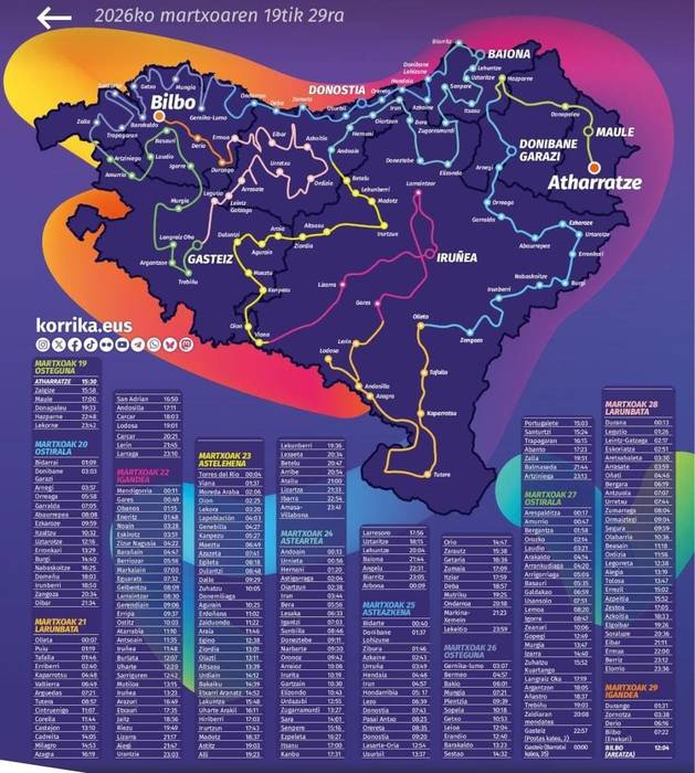 Antolatzaileek jakinarazi dute iblbidearen xehetasun guztiak webgunean eta aplikazioan egongo direla kontsultagai. Herriz herri, kalez kale, errepidez errepide... euskara garela erakutsiko du Korrikak 11 egunez eta hamar gauez. 2.175 kilometro eta 3.436 lekuko hartze inguru egingo ditu euskararen herrian zehar. Hiriburuen artean, Maule bisitatuko du lehendabizi Korrikak: Atharratzetik atera eta 16:45ean helduko da bertara. Donibane Garazin, ordea, martxoaren 20an, ostiralarekin, izango da, 02:50ean. Iruñera, aldiz, martxoaren 22an iritsiko da, igandearekin. Alde Zaharrera bazkalorduan helduko da, 14:30ean. Baionaren txanda izango da gero. Martxoaren 24an, asteartearekin, iritsiko da bertara, 20:30ean. Donostiatik, hurrengo egunean, martxoaren 25ean, asteazkenarekin, igaroko da, 08:15ean Altzan sartuko da, eta eguerdia baino apur bat lehenago iritsiko da Parte Zaharrera. Horrela, 27an, ostiralarekin, 21:00ak aldera, Gasteizen lurreratuko da euskararen aldeko ekimen erraldoia.