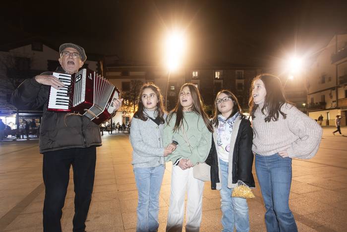 Arratsaldeko zazpiak jo dutenerako hasi dira pentsiodunen taldeko ordezkariak eta Xumela koruko kideak Okendo plaza betetzen, azken horiek entseatzera joan aurretik. Pentsio eta bizitza duinen aldeko borroka nola dagoen errepasatu baino lehen lau gaztetxo hurbildu zaizkie eta eurekin kantatu nahi dutela esan diete. Gustura hartu dituzte taldean eta Behin betiko kantatu dute, moldaketatxo batekin: "Euskaraz Euskal Herrian" beharrean, "Pentsiodunak aurrera" esan dute. Amaitzean, Xumelako zuzendari Josu Txapartegi Txapas neskatoei zuzendu zaie eta egunen batean, pentsiodunak direnean, gaurko ekitaldia oroitzeko eskatu die. Horrekin batera, honakoa azpimarratu du: "Ahaztu egiten zaigu batzuetan baina pentsiodunok ez dugu gugatik soilik borrokatzen, baita belaunaldi gazteagoengatik ere".
