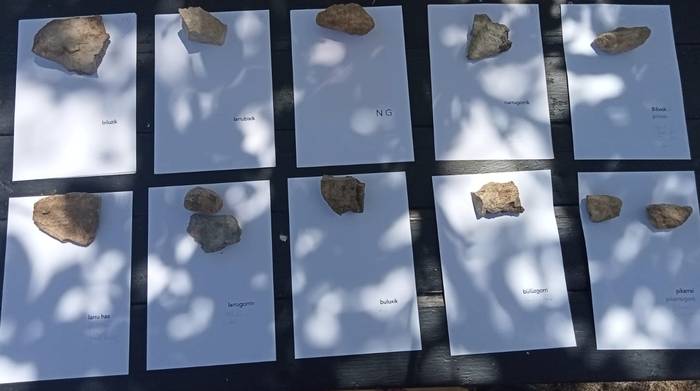 Harriei buruz ere galdetu didazu. Konposizio lana egin bitartean paper pilo bat nuen eta paseo lekuak normalean haizetsuak zirenez, horiek eusteko erabiltzen nituen. Horrez gain, eta saiatzen naiz estraktibista ez izaten [barreak], baina ibiltzen noanean gustatzen zait harriak hartzea. Horien konposizioa oso interesgarria da zerikusia duelako konpostarekin, hartzidurarekin, deskonposatzearekin eta beste zerbait bihurtzearekin.