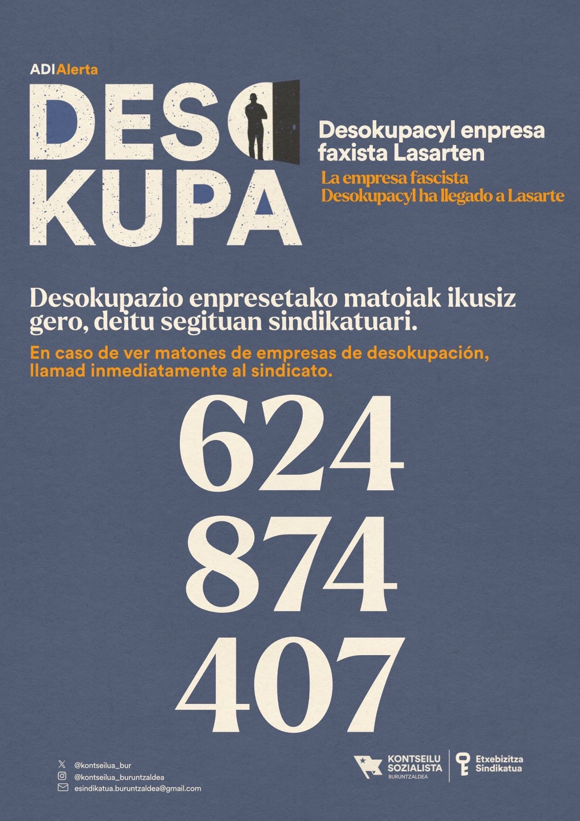Buruntzaldeko Etxebizitza Sindikatuko ordezkariek jakinarazi dute "Desokupa enpresako matoi faxistak" agertu direla gaur goizean Zumaburu auzoko Erribera kalean. Ordezkariren bat ikustekotan, sindikatukoekin harremanetan jartzeko deia egin diete lasarteoriatarrei, 624 87 44 07 telefono zenbakira "berehala" deituta.
