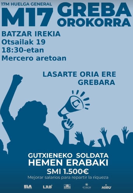 ELA, LAB, Steilas, Hiru eta Etxalde sindikatuek greba orokorra deitu dute datorren martxoaren 17rako. Mobilizazio horren bitartez, Hego Euskal Herrian 1.500 euroko Lanbidearteko Gutxieneko Soldata ezar dadin eskatuko dute. Deialdi horren oihartzuna iritsi da Lasarte-Oriara eta herritar talde batek jakinarazi du egun hori antolatzen hasteko bilera irekia aurrera eramango duela gaur, Antonio Mercero aretoan, 18:30etik aurrera. "Zatoz eta guztion artean antolatuko dugu eguna", adierazi dute.