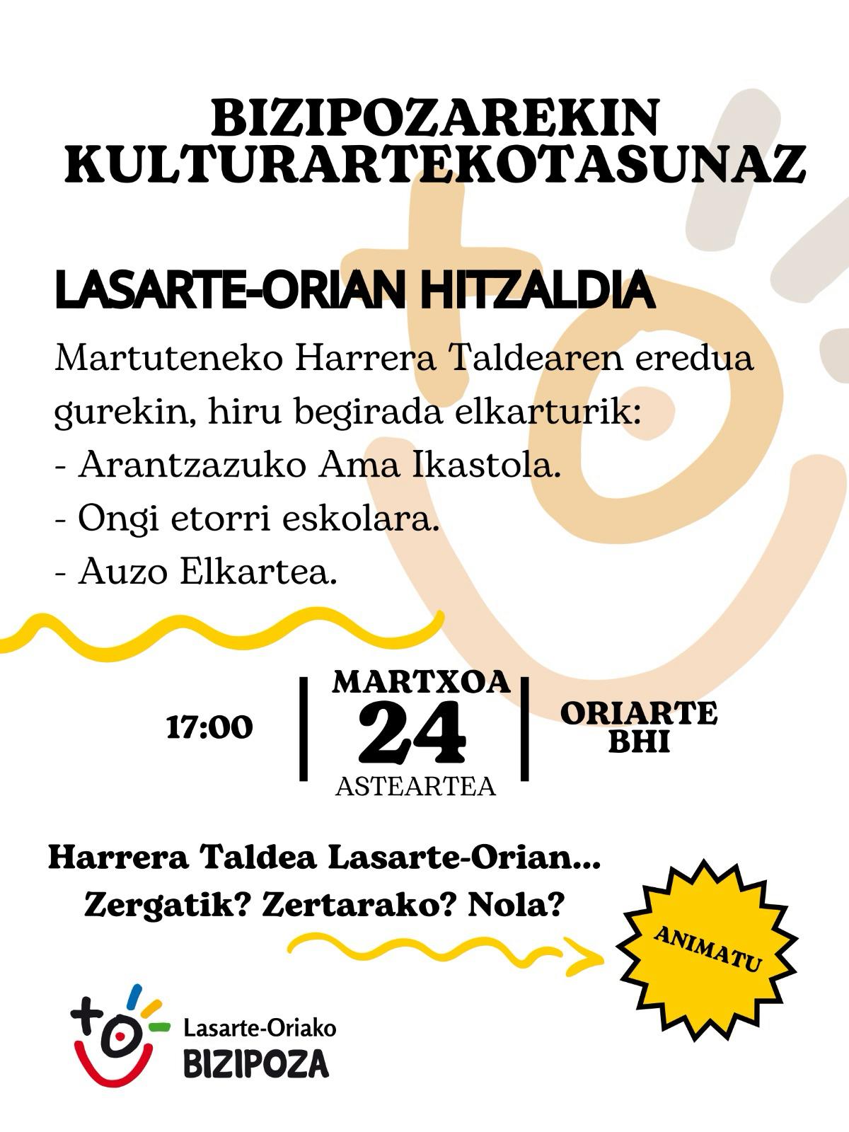 Harrera taldea Lasarte-Orian... Zergatik? Zertarako? Nola? izenburua jarri diote hilaren 24ko saioari. Arantzazuko Ama ikastolako, Ongi etorri eskolara ekimeneko eta Martuteneko auzo elkarteko kideak etorriko dira bertan egiten ari diren lana erakustera.