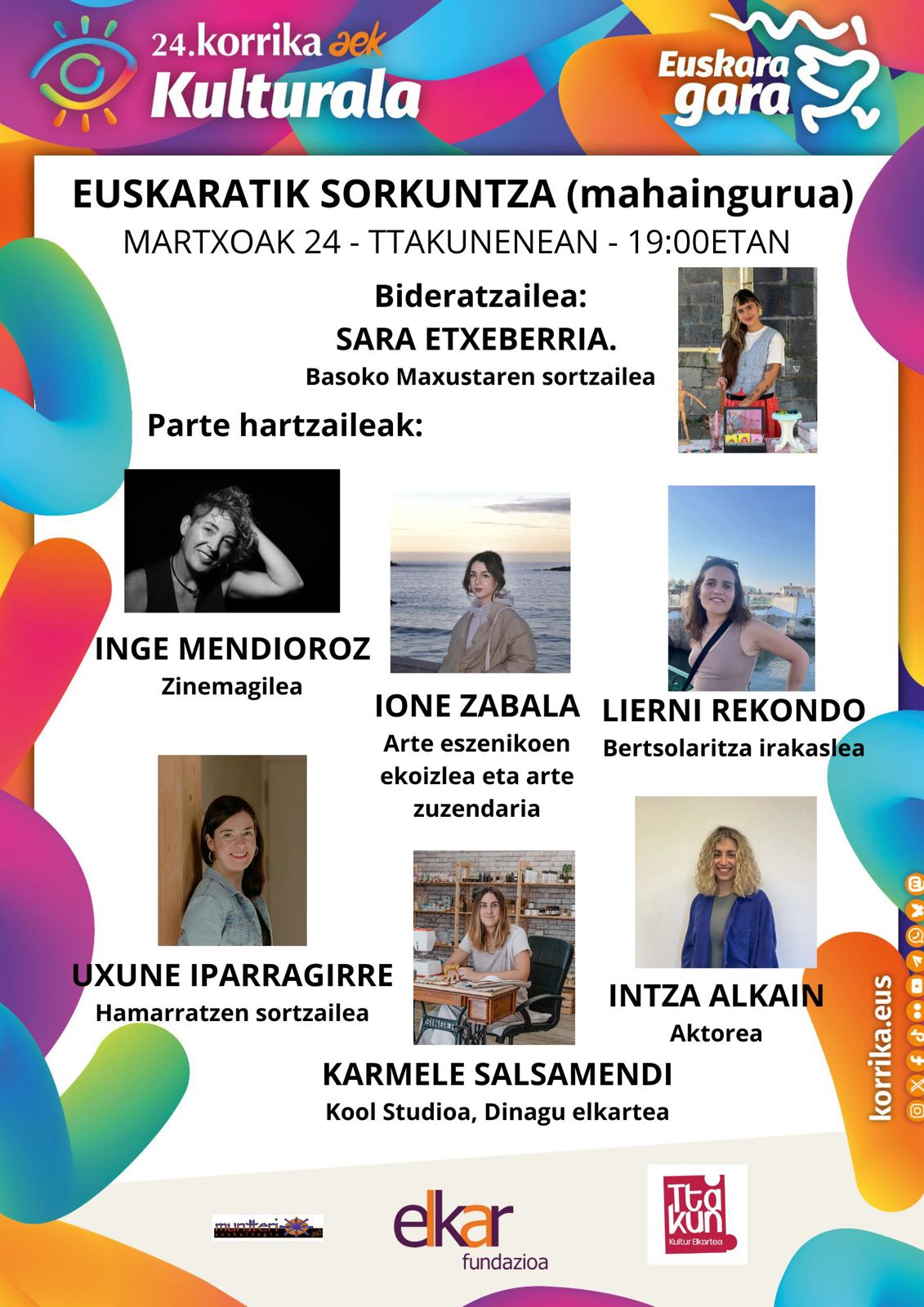 Emakumezko zazpi emakume sortzailek euren lana, bizipenak eta ametsak partekatuko dituzte Ttakunenea elkartean bihar, Korrika Kulturala ekimenaren barruan aurrera eramango duten hitzaldian. 19:00etan hasiko da. Sara Etxeberria 'Basoko Maxuxta' ilustratzaileak bideratuko du ekimena eta Inge Mendioroz zinemagileak, Ione Zabala arte eszenikoen ekoizlea eta arte zuzendariak, Lierni Rekondo bertsolaritza irakasleak, Uxune Iparragirre Hamarratz proiektuaren sortzaile Uxune Iparragirrek, Intza Alkain aktoreak eta Dinagu elkarteko kide nahiz Köol Studio saltokiaren jabe Karmele Salsamendik parte hartuko dute.