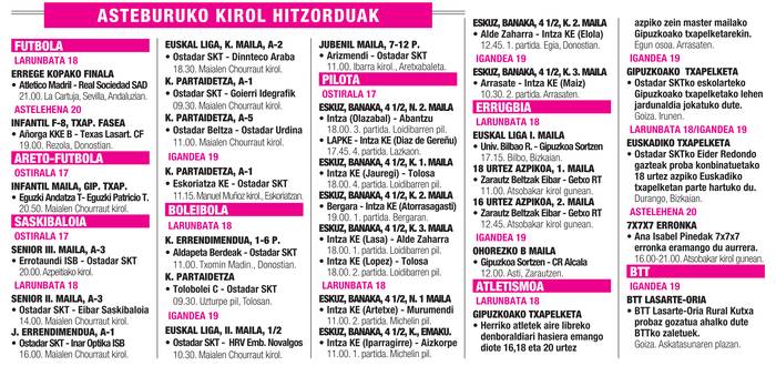 Hilaren hirugarren asteburuko kirol hitzorduak, baita asteleheneko pare bat ere:
