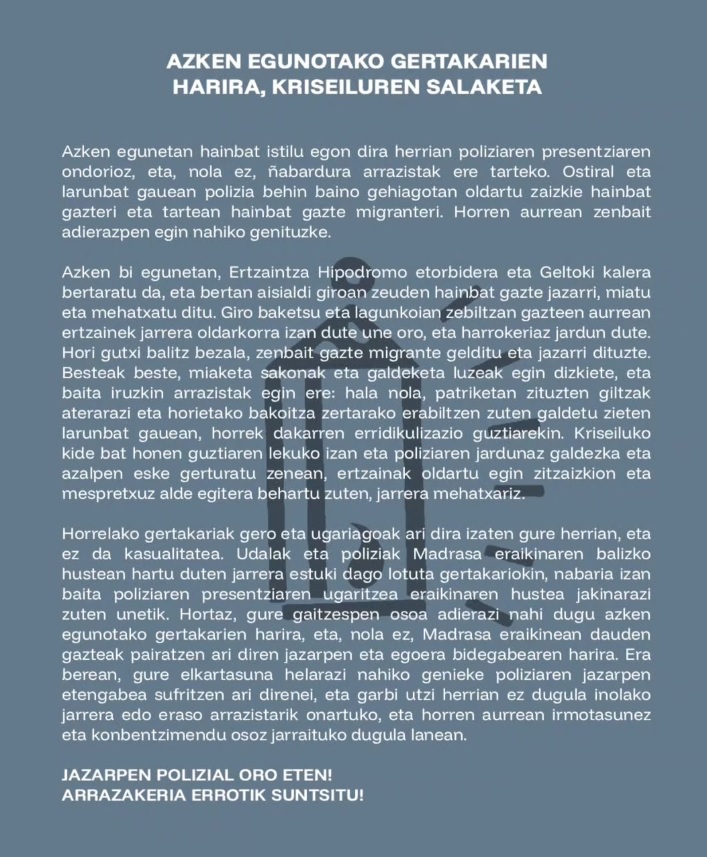 Horrelako gertakariak gero eta ugariagoak ari dira izaten gure herrian, eta ez da kasualitatea. Udalak eta poliziak Madrasa eraikinaren balizko hustean hartu duten jarrera estuki dago lotuta gertakariokin. Hortaz, gure gaitzespen osoa adierazi nahi dugu azken egunotako gertakarien harira, eta, nola ez, Madrasa eraikinean dauden gazteak pairatzen ari diren jazarpen eta egoera bidegabearen harira. Era berean, gure elkartasuna helarazi nahiko genieke poliziaren jazarpen etengabea sufritzen ari direnei, eta garbi utzi herrian ez dugula inolako jarrera edo eraso arrazistarik onartuko, eta horren aurrean irmotasunez jarraituko dugula lanean.
